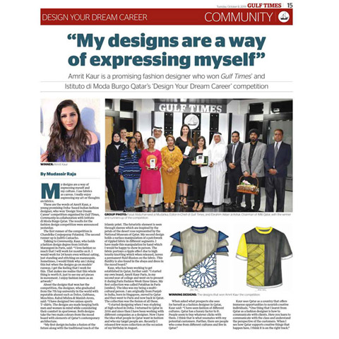 My full page interview in Gulf Times Community speaking of my brand Amrit Kaur Paris & my win in Design Your Dream Career competition organized by Gulf Times & Istituto di Moda Brugo.